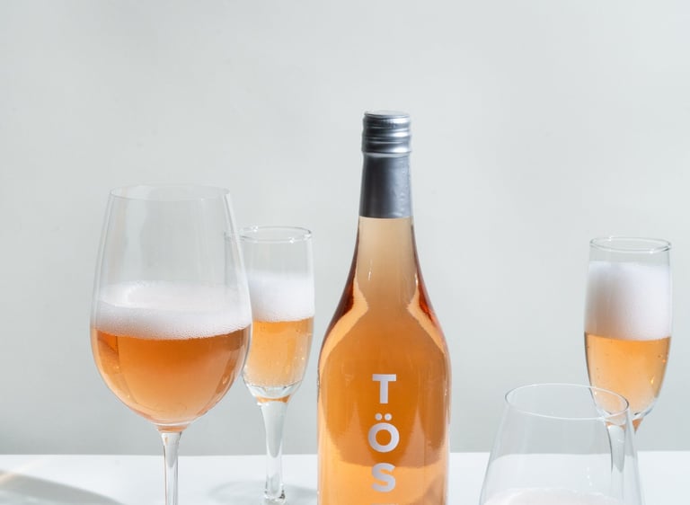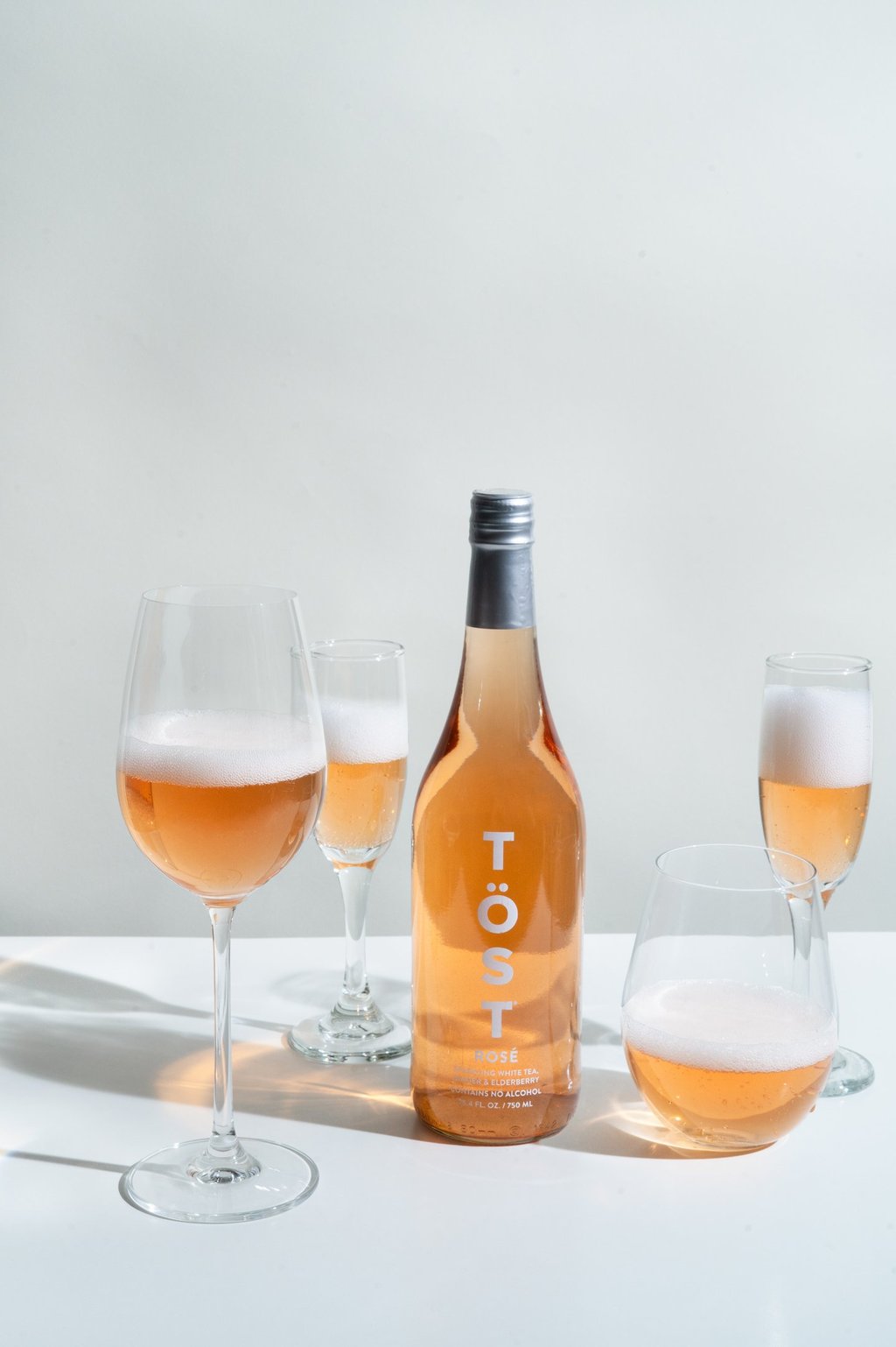 Product imagery positioning Töst within the visual language of luxury champagne.