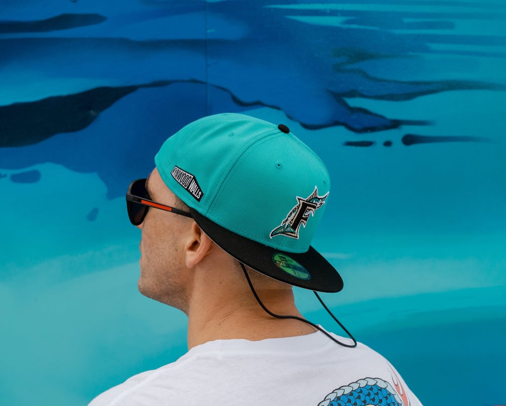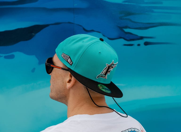 Product launch imagery capturing the Wynwood Walls × Miami Marlins collaboration through bold color and cultural alignment.